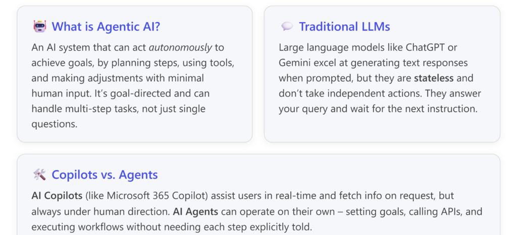 In the fast-moving world of AI, agentic AI is emerging as the next big step beyond traditional large language models (LLMs) and standard “copilot” assistants. Unlike a typical LLM that only responds when spoken to, an agentic AI can take autonomous actions towards a goal – it’s less a passive assistant and more an active problem-solver. This post will explain what agentic AI means, how it differs from well-known AI like ChatGPT, Google’s Gemini, or Microsoft’s standard Copilots, and how businesses can harness it using Microsoft Copilot Studio to build bespoke AI agents.