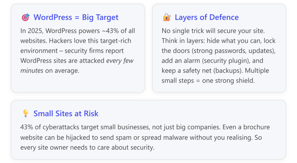 Does hiding WordPress make you bulletproof? No – if you’re running outdated or insecure software, a skilled attacker can still uncover and exploit it. But obscuring your site’s identity can deter the huge volume of automated attacks that scan for easy targets. It’s an optional layer of defence. Think of it as camouflage – it won’t stop a sniper, but it might avoid drawing the attention of roaming bandits on the web. Just be sure to pair this with the real defenses below. [elegantthemes.com]