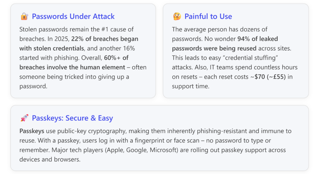 - 🙍♀️ User memory & effort:Passwords rely entirely on human memory (or a manager app). Creating and recalling dozens of strong, unique passwords is practically impossible without help. Users often resort to writing them down, using the same one everywhere, or picking simple ones – all of which hurt security. Passkeys remove this burden. Users don’t need to craft or memorize secrets. When setting up an account, instead of “Please create a password”, it’s “Want to use a passkey?” – and with one tap a cryptographic key is created. Going forward, logging in is as simple as unlocking your device (which you’re doing 50 times a day anyway). There’s no “I forgot my password” because there is no password to forget. This dramatically cuts down helpdesk calls for resets and the frustration employees feel when locked out. Small business owners know that forgotten passwords can derail a whole morning’s work – passkeys can virtually eliminate that scenario.